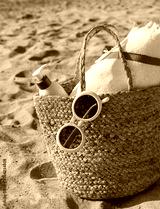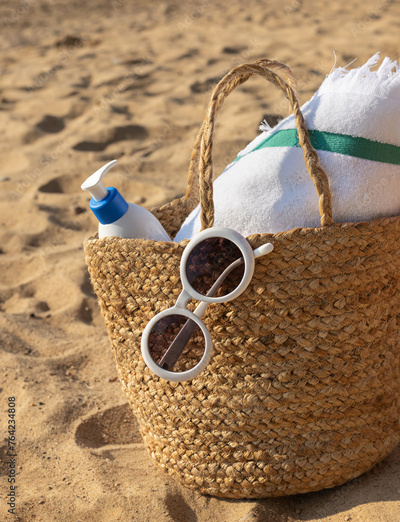 Jute bag with sunscreen bottle, beach towel and sunglasses on the sand. Summer vacation lifestyle concept