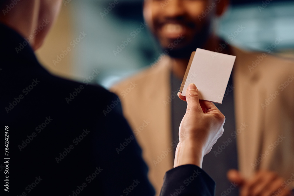 Close up of receptions giving cardkey to guest who is checking in at hotel.