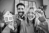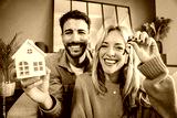 Young couple celebrating a beginning at their new home holding the key of the house. Real estate investment. Mortgage or loan ad. Happy property owners at living room. Married people achievement