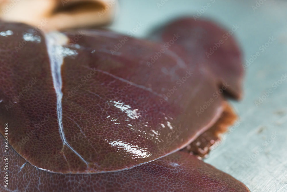 closeup shot of pig liver, cutting pig meat at the butchers shop, food industry. High quality photo