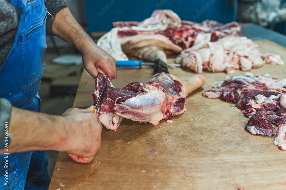 Meat processing in food industry, cutting pork into pieces. High quality photo