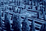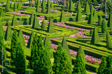 View of the garden labyrinth trees hedge and pyramid shaped trees blooming lilac flowers
