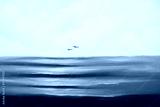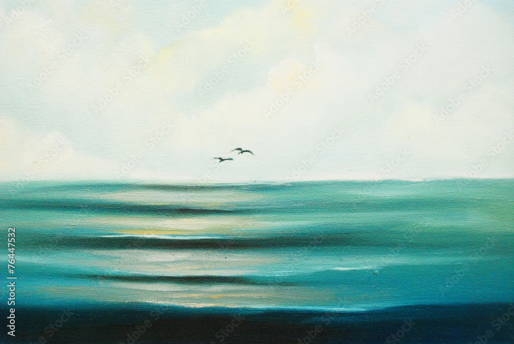 Beautiful blue ocean and a couple of flying birds. Oil painting