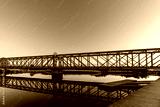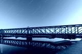 Former train tracks turned bridge named Den Blå Bro at night between golden and blue hour sunset over the Gudenå river in Randers Denmark