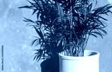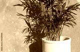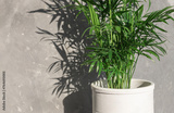 Chamaedorea or Areca palm plant leaves on the grey concrete texture background. Copy space
