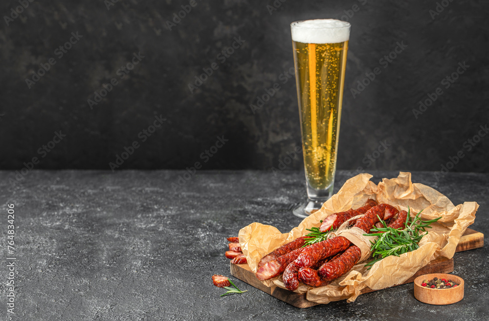 beer and sausages, Long meat sausages with glass of beer. Long banner format. copy space for text