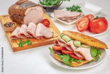 sandwich with pork ham, cheese and salad on a light background, top view. copy space