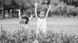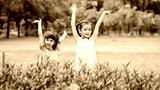 Happy two young girls raising hands together in park, Cute Little Girl having fun, Exuberant little child enjoying spring season in the park.