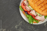 meat sandwich. grilled ham sandwich pork sausage food snack on a dark background. top view. copy space for text