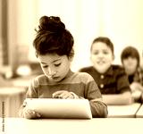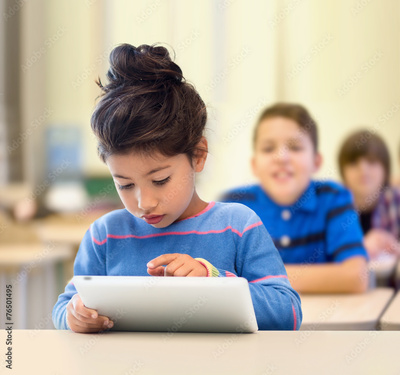 little school girl with tablet pc over classroom