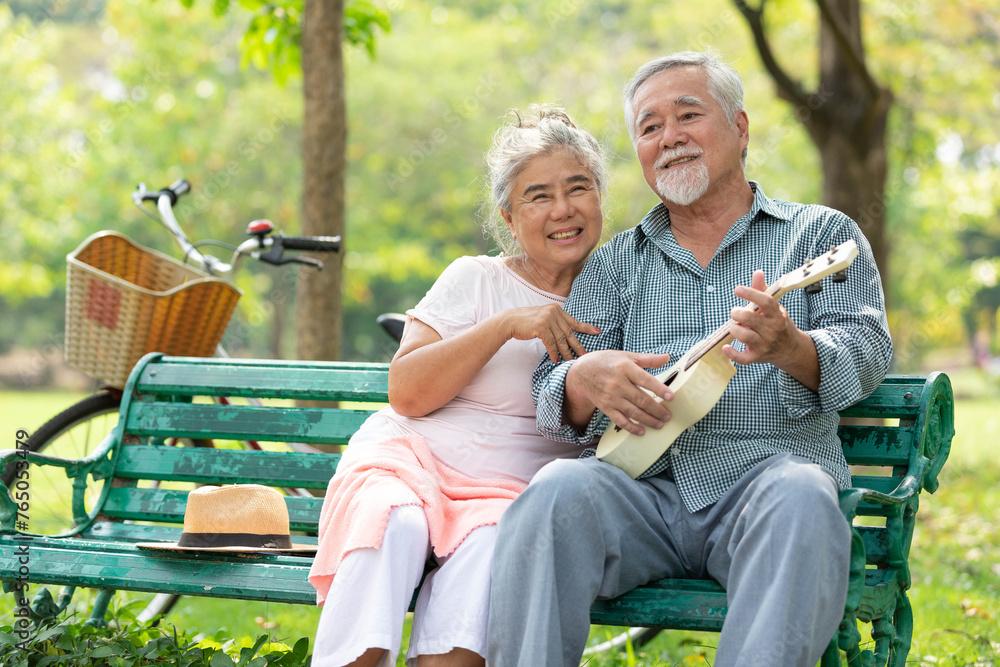 senior couple in love and playing ukulele in the park