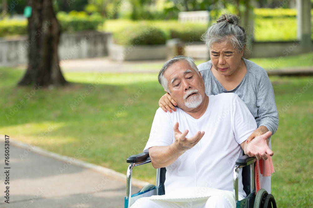 senior man sitting on a wheelchair and distorted face beside senior woman in the park