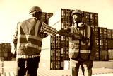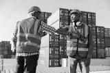 African factory workers or engineer greeting with elbow bumps in containers warehouse storage
