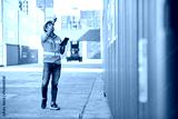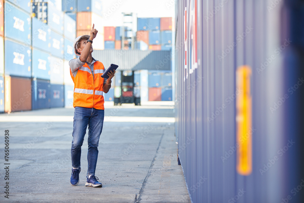 factory worker or engineer looking up and pointing to something in containers warehouse storage