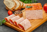 Whole ham covered with aromatic spices with slices on a wooden board, top view. copy space