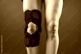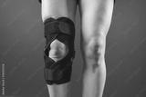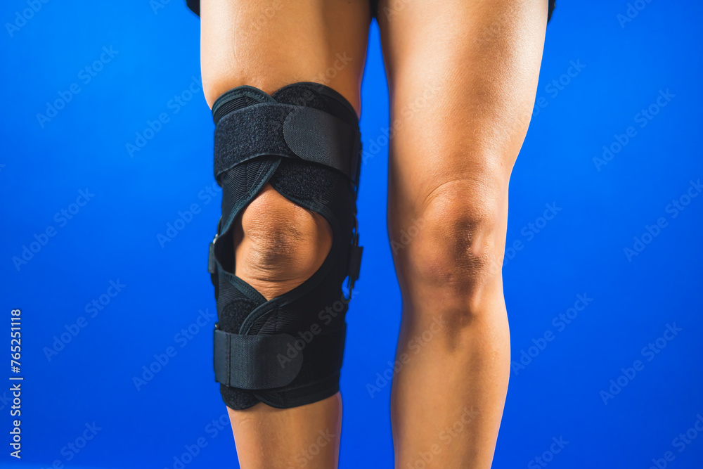 woman's legs with a knee support brace, healing and recovering from injuries. High quality photo