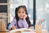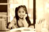 A young girl is sitting at a desk with a laptop and a book