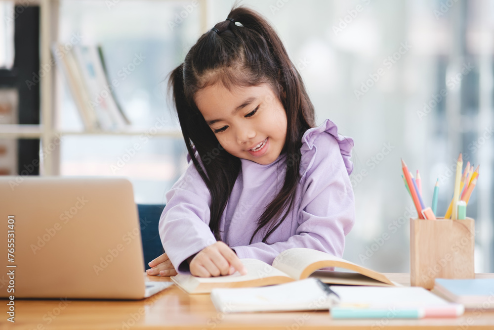 A young girl is sitting at a desk with a laptop and a book
