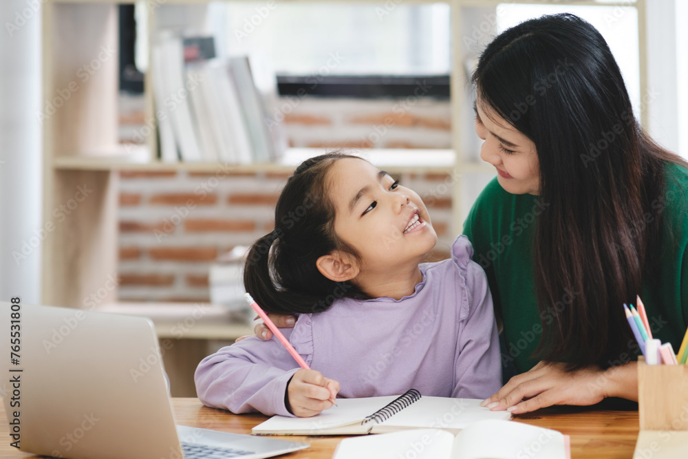 A woman is helping a young girl with her homework
