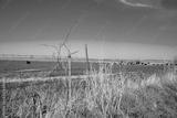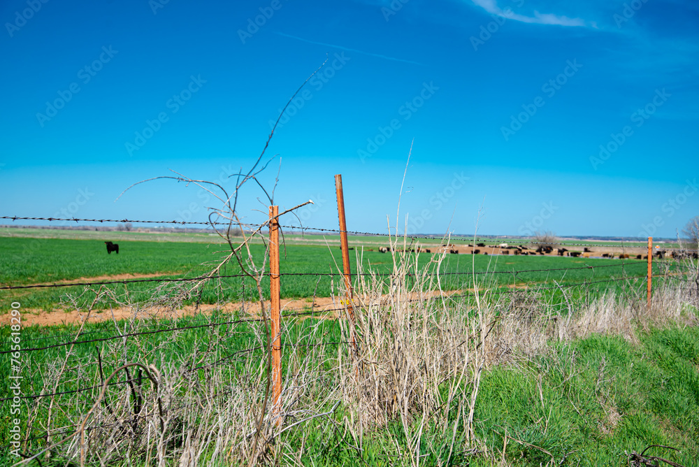 Weather T-post and barbed wire fencing over large ranch farmland with huge herds of Aberdeen Angus cattle cows grazing, grass feed, livestock ranching under sunny cloud blue sky, agriculture