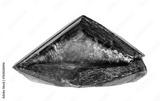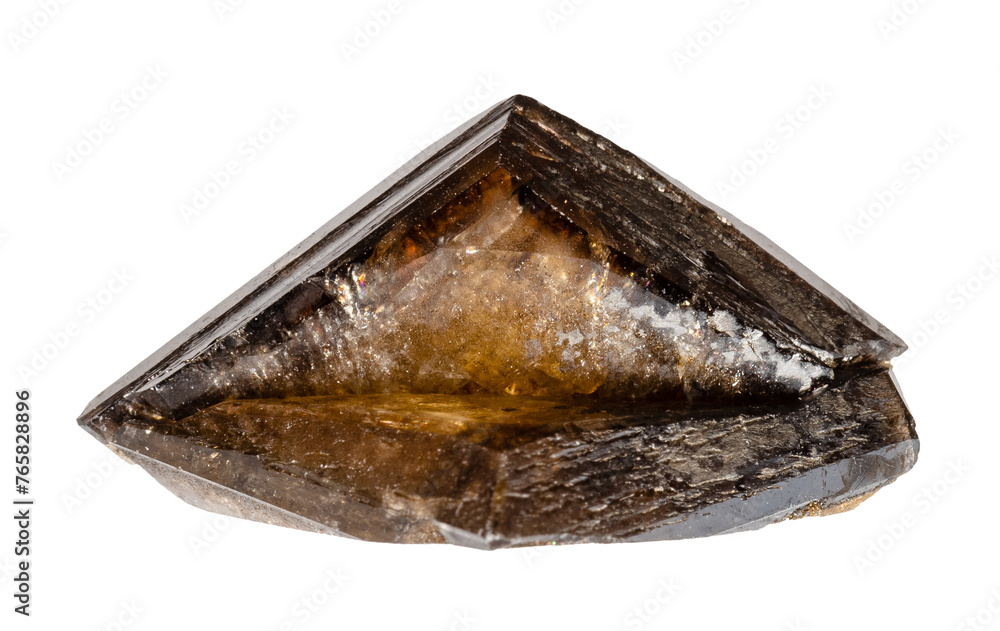 close up of sample of natural stone from geological collection - raw twinned brown titanite crystal isolated on white background from Subpolar Urals