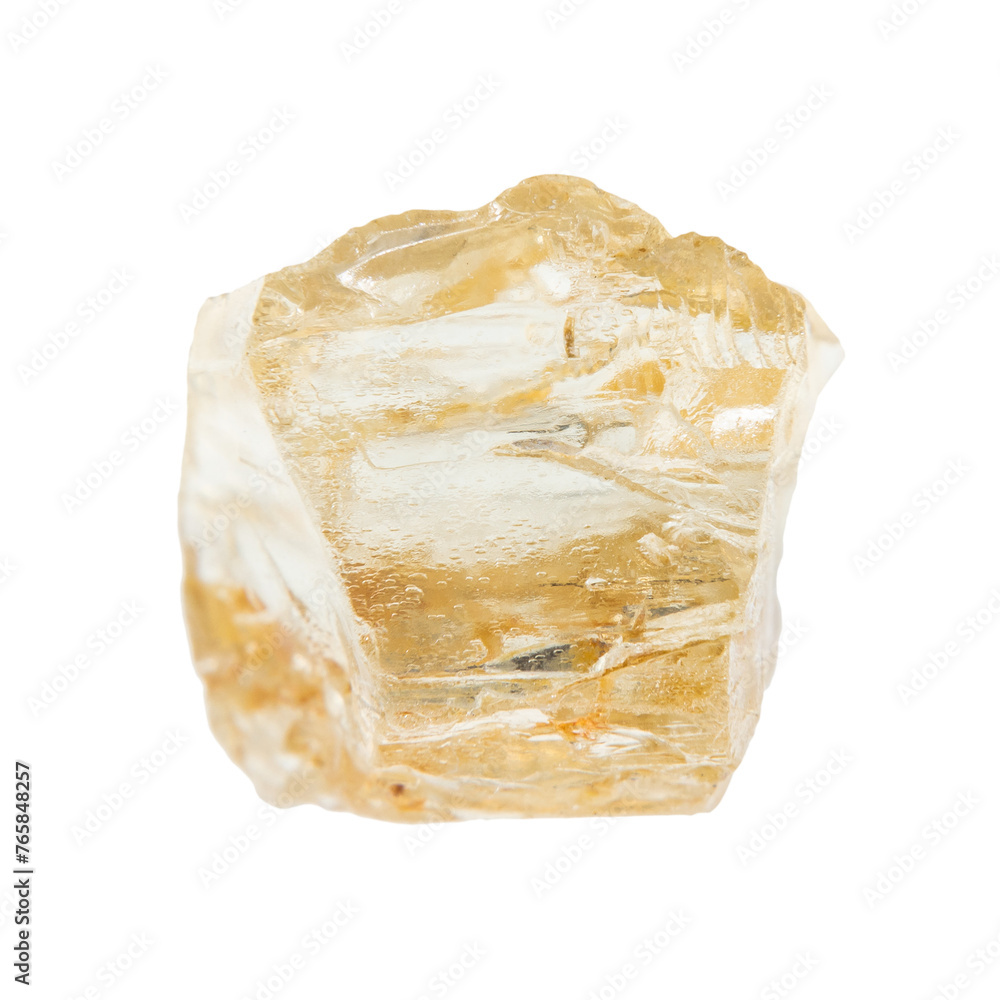 close up of sample of natural stone from geological collection - uncut yellow scapolite crystal isolated on white background from Tajikistan