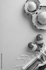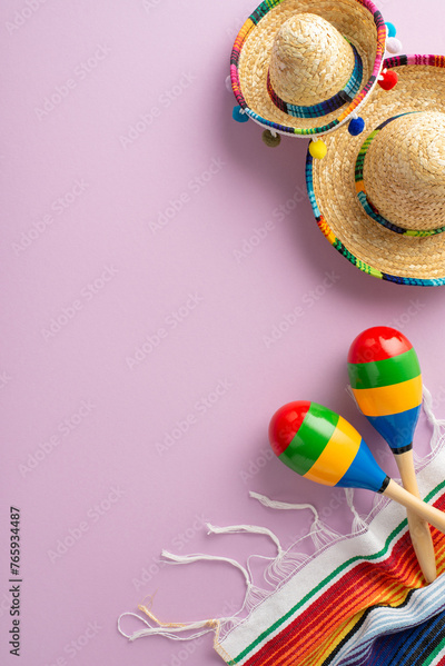 Celebratory Cinco de Mayo composition from vertical top view, showcasing thematic decorations like sombreros, maracas, a lively serape, all arranged on a gentle purple surface