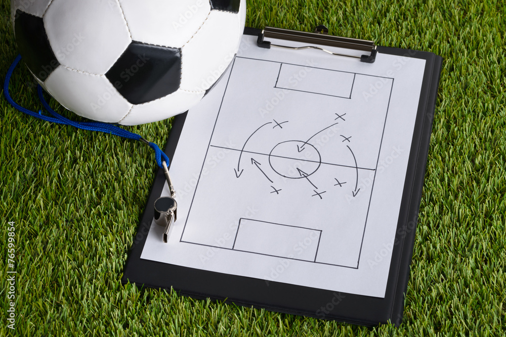 Ball; Whistle And Soccer Tactic Diagram On Pitch
