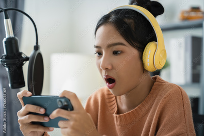 Excited Young Asian woman wearing headset and playing online game on smartphone with live broadcasting on internet.