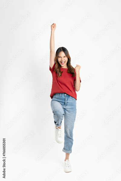 Smiling cheerful Asian girl standing and Raise your hand with enjoys freedom on white background.