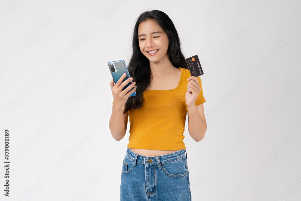 Cheerful beautiful Asian women wear an green shirt with holding credit card isolated on white background.