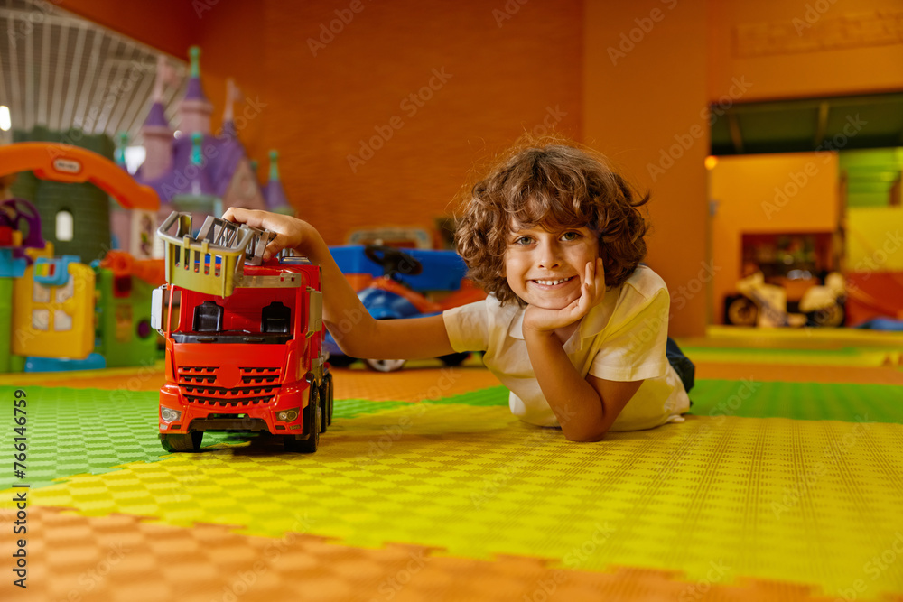 Boy child playing vehicle toys at kids care center