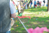Shallow DOF long line of diverse parents kids near pennant tape barricade line waiting for Easter egg hunting tradition at local Church in Dallas, Texas, decorated Paschal on green grass meadow