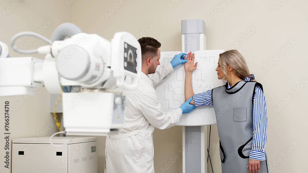 A specialist doctor in an X-ray room, a radiologist sets up a machine for radiography of a patient and makes a scan. The concept of medical technologies, modern medical equipment.