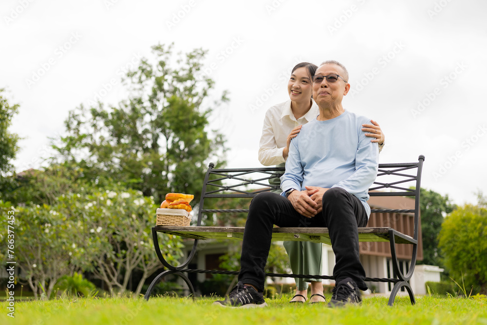 Asian nurse caring for an old man in the garden at home, nurse caregiver supporting health insurance at home or hospital, elderly man