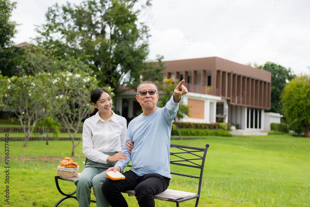 Asian nurse caring for an old man in the garden at home, nurse caregiver supporting health insurance at home or hospital, elderly man