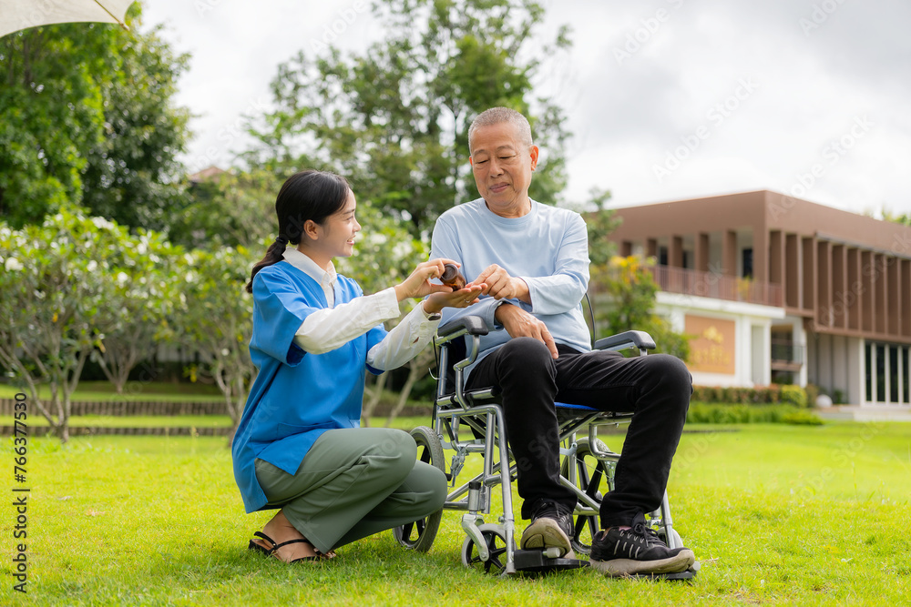 Asian nurse caring for an old man in the garden at home, nurse caregiver supporting health insurance at home or hospital, elderly man