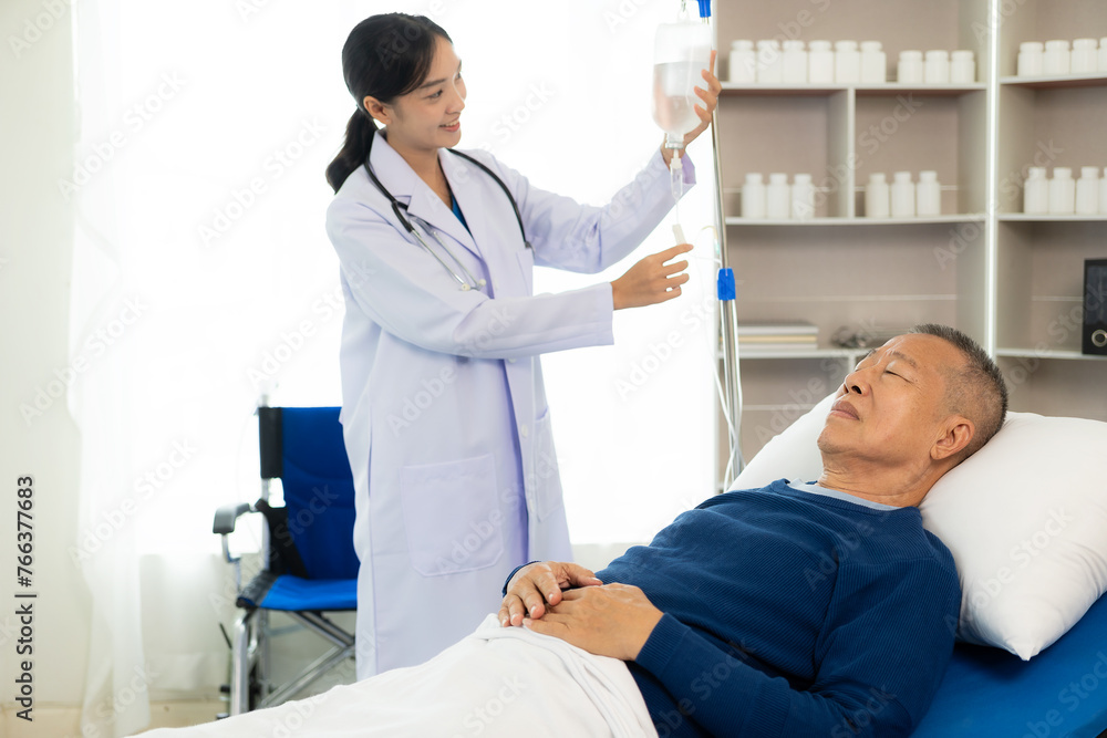 An old man hospitalized lies in bed while a doctor checks his pulse. Doctor or nurse examining a senior male patient, caring for and encouraging him in the hospital room, lying on the bed.