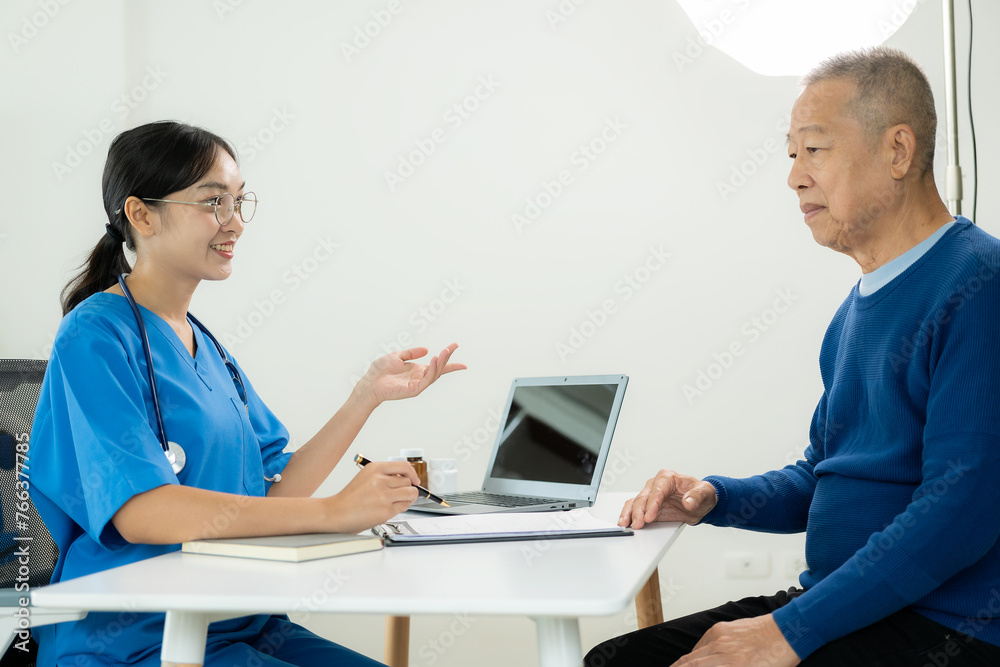 Asian professional female doctor talking with male patient about his pain and symptoms while giving consultation at table in examination room at health care hospital