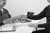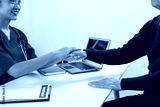 Asian professional female doctor talking with male patient about his pain and symptoms while giving consultation at table in examination room at health care hospital