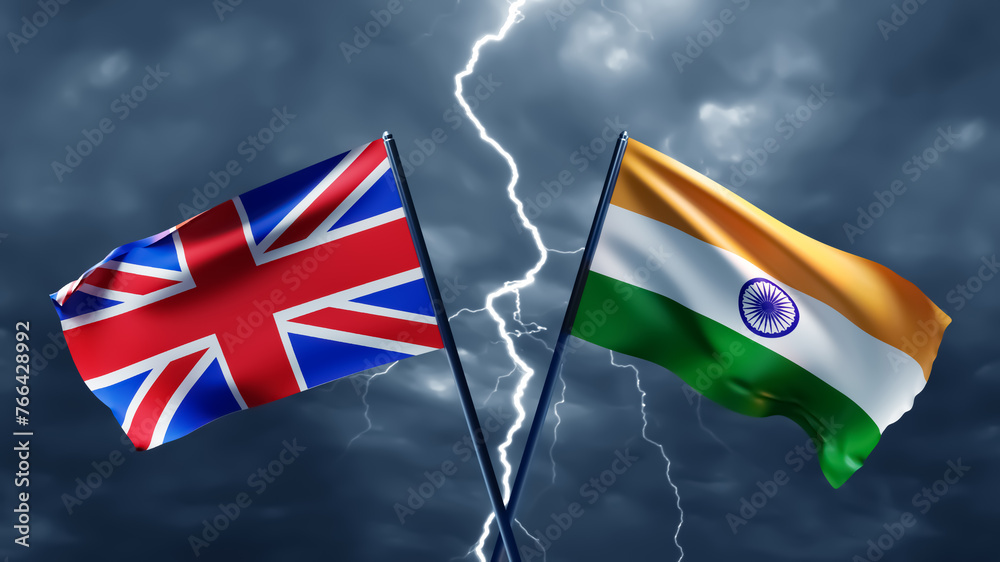 Flags Great Britain and India. National symbols of two countries. State flags under stormy sky. Diplomatic relations Great Britain and India. Metaphor for political contradictions. 3d image