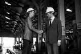 businesspeople shaking hands before start work at construction site
