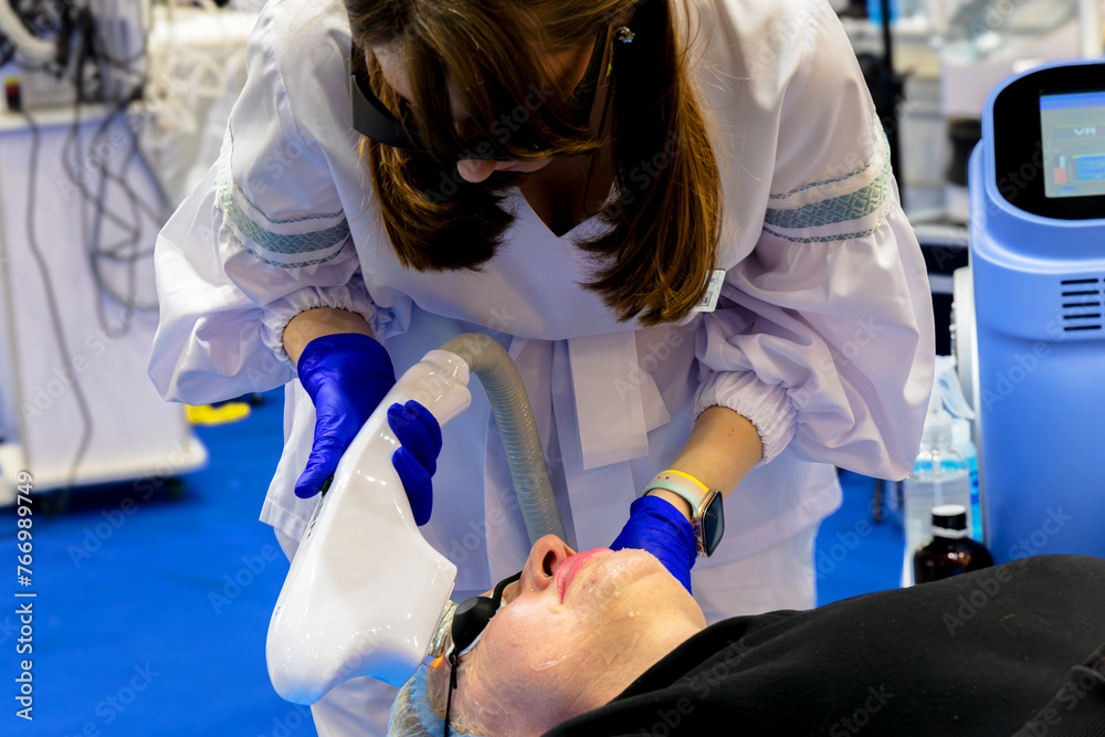 A cosmetologist performs procedures on the face of a woman lying on the couch. Intense pulsed light IPL is a type of light therapy used to treat various skin conditions.
