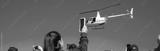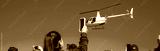 Panorama view hands taking photo hovering helicopter drops colorful eggs and goodies at Easter event in Richardson, Texas, rear view diverse group of people with mobile phone, Chistian tradition
