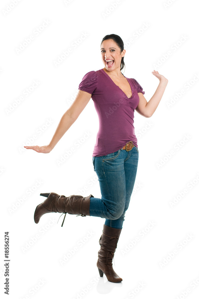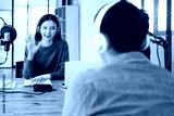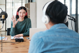 A woman wearing headphones is talking to someone on a laptop. The woman is smiling and waving at the person on the laptop