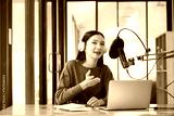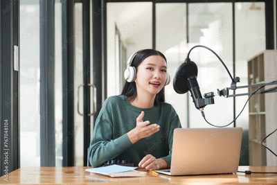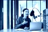 A woman is sitting at a desk with a laptop and a microphone. She is wearing headphones and she is talking into the microphone. The scene suggests that she might be a radio host or a podcast host