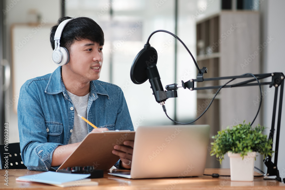 A man wearing headphones is sitting at a desk with a laptop and a plant. He is smiling and he is enjoying himself