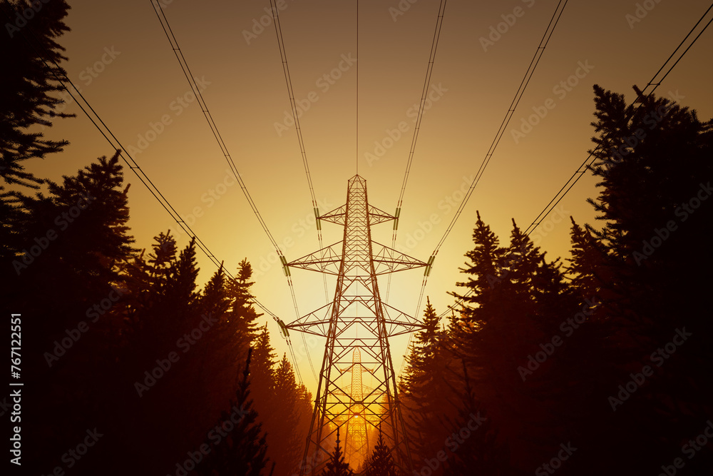 Dramatic Sunset Silhouette of Power Transmission Tower Amidst Dark Trees