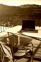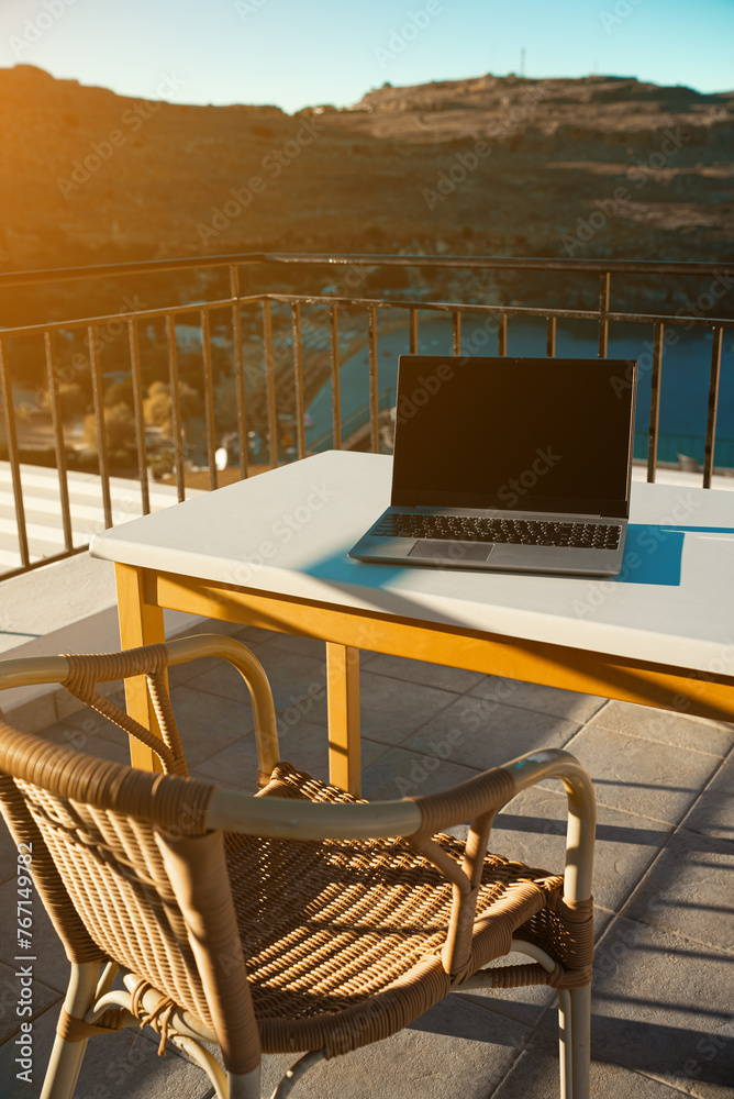 Laptop on the table on the balcony. Freelancing and remote work concept.
