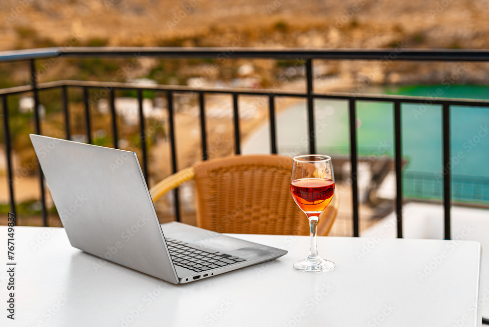 Laptop and a glass of wine. An ideal place for remote work.